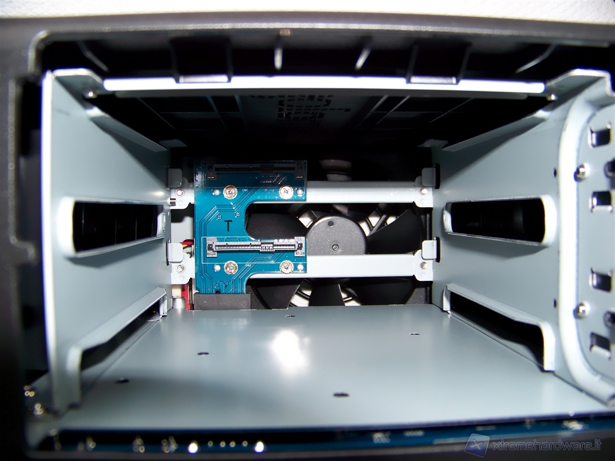 Una volta rimossi i due bay possiamo scorgere all’interno della feritoia i due connettori SATA e la ventola di raffreddamento.