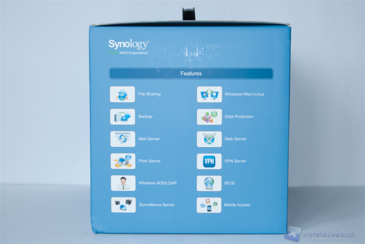 Come per gli altri modelli, anche la scatola del DS412+ si presenta di un colore blu sgargiante e riporta informazioni utili all'acquisto.
