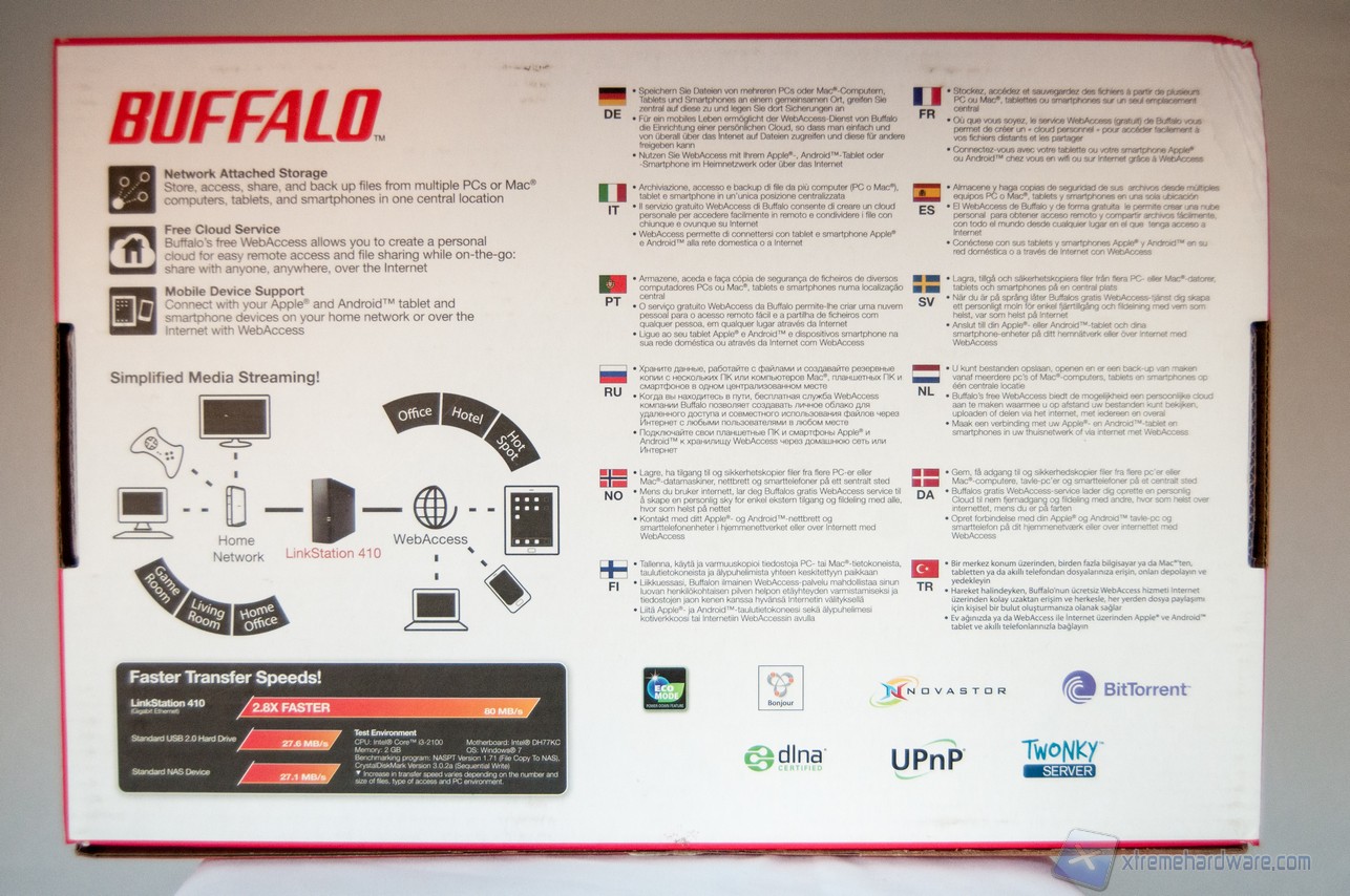 Il Buffalo LinkStation LS410D viene venduto all'interno di una scatola in cartone bianca e rossa riportante numerose informazioni riguardanti il prodotto.