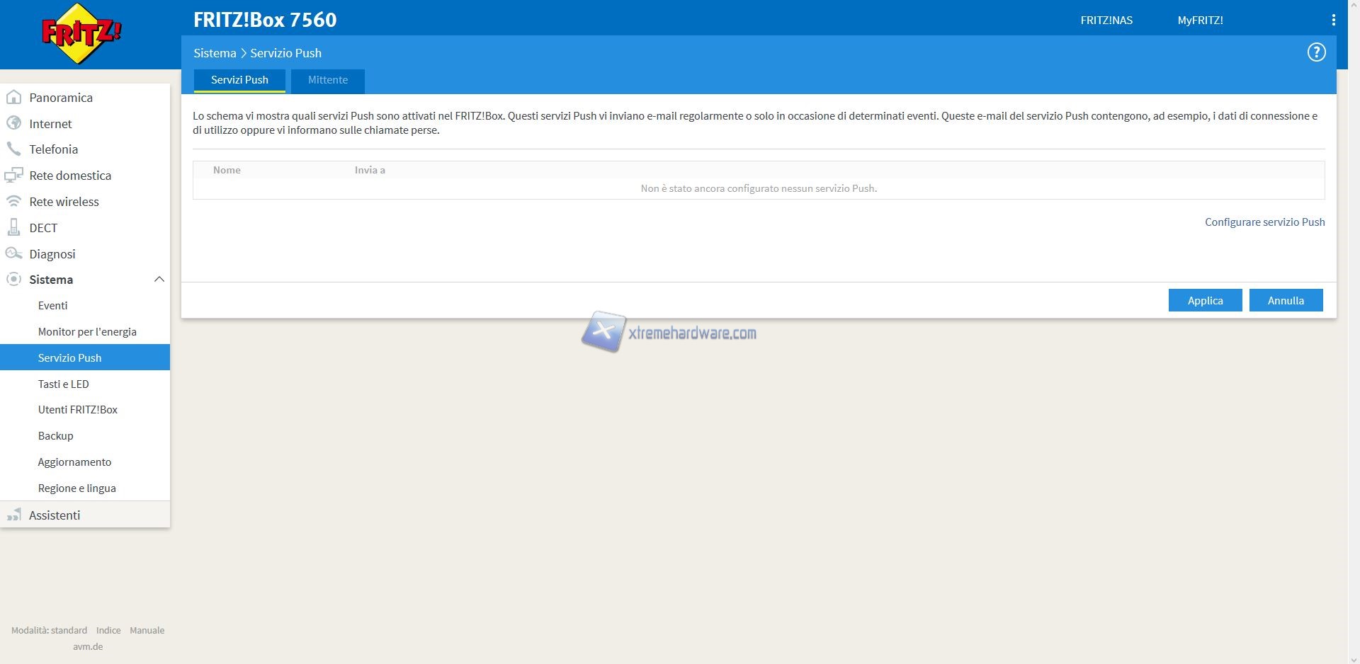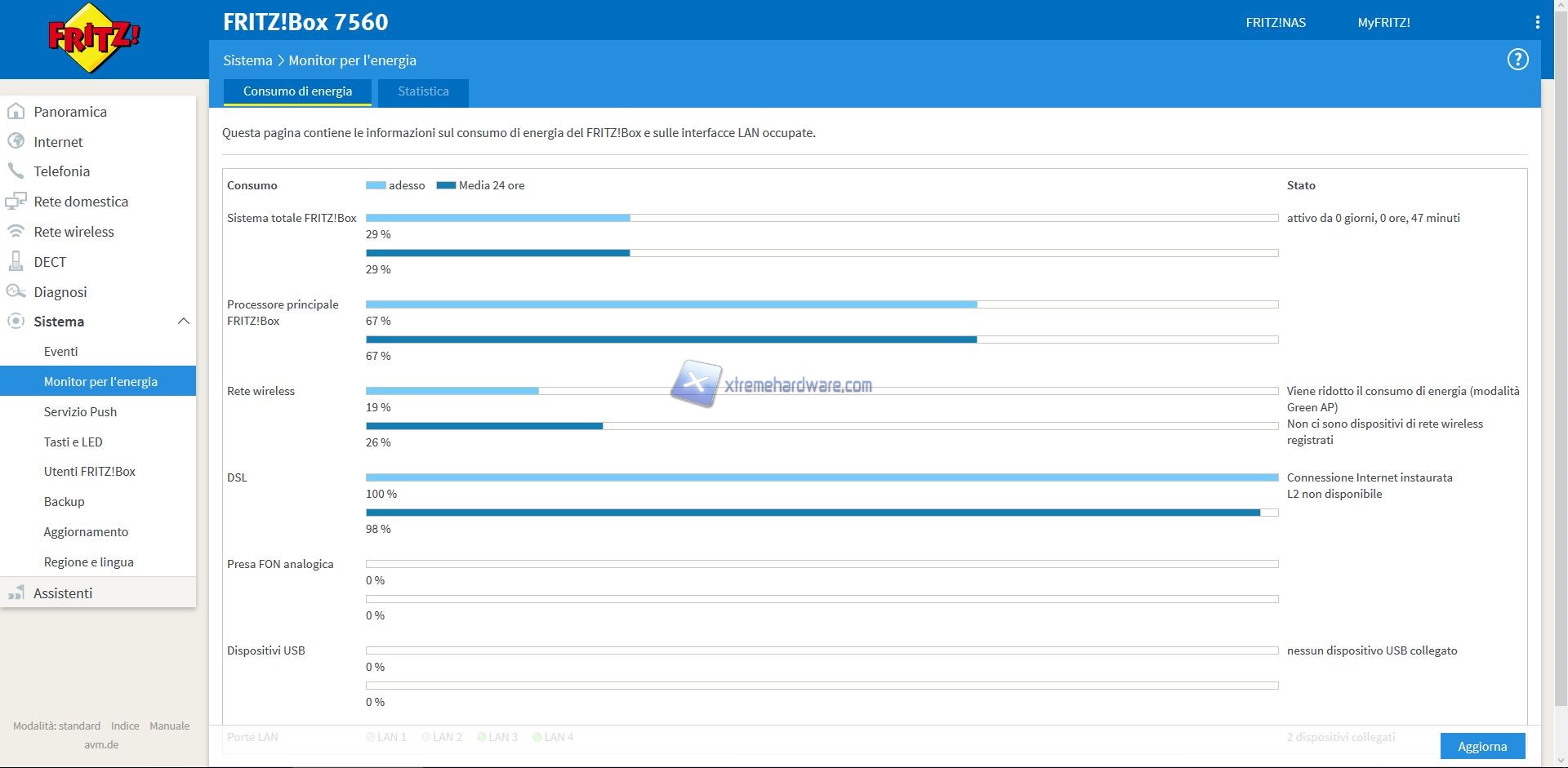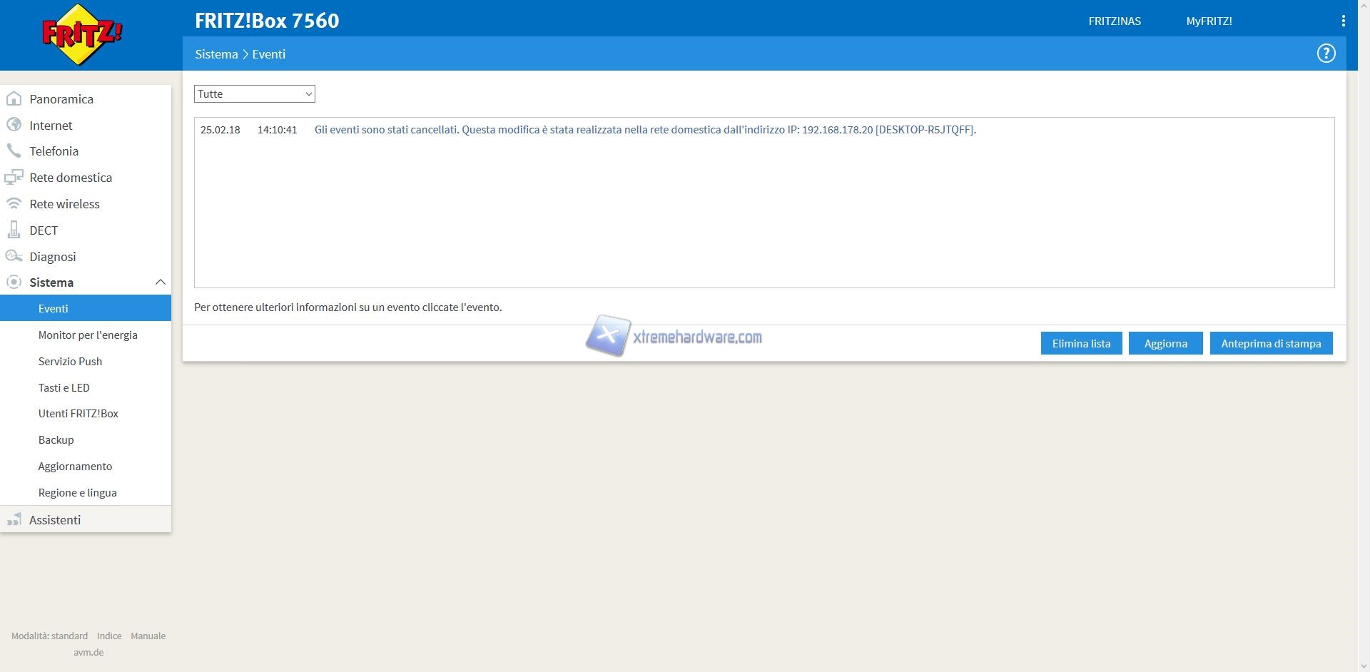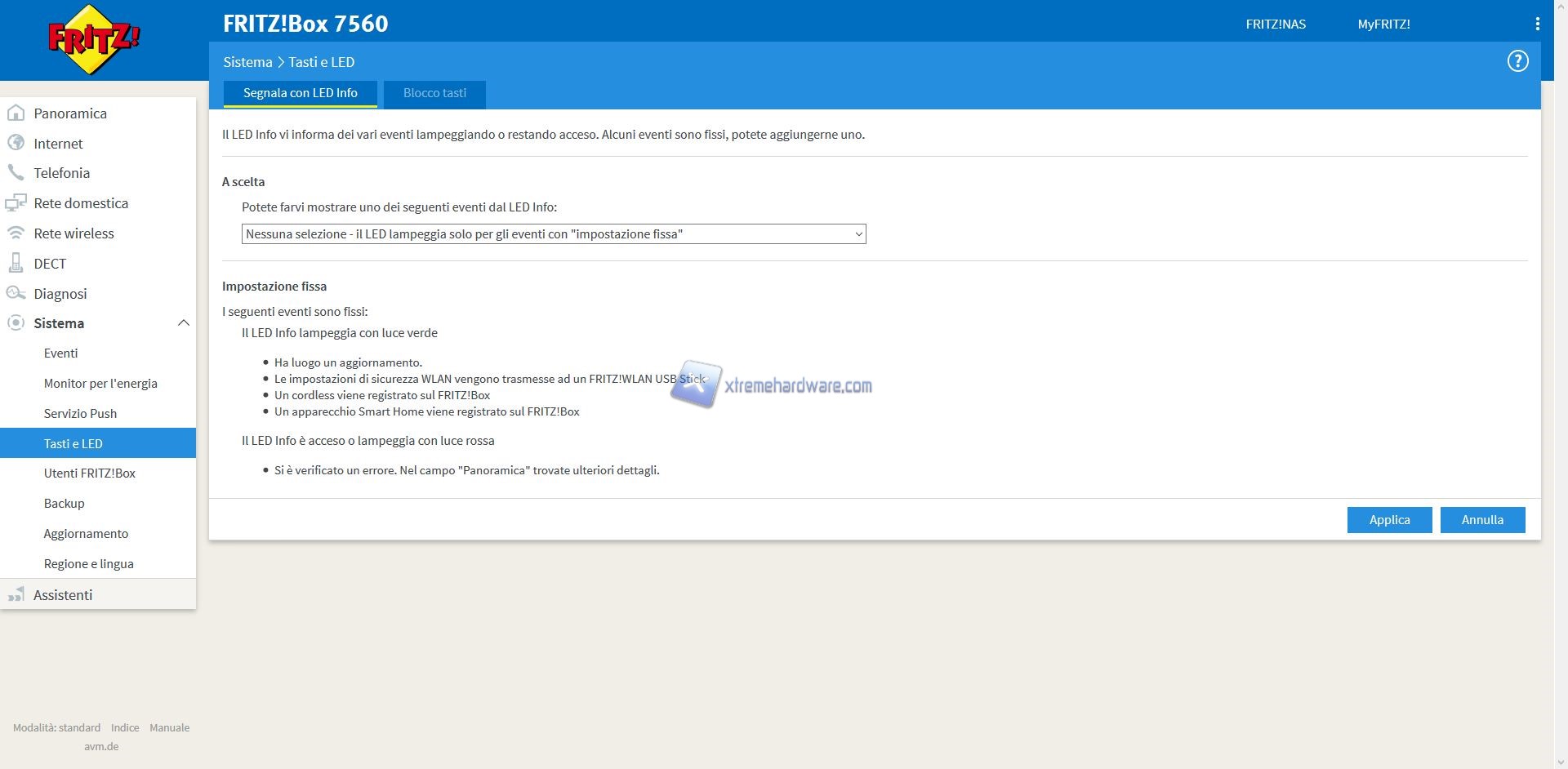 ‘’Sistema’’ dove troveremo impostazioni più classiche come gestione Eventi in caso di problemi, regolazione della data, eventuale Backup delle impostazioni generali, aggiornamento o controllo disponibilità nuova release Firmware e così via. Presente anche la possibilità, in tutti i prodotti FRITZ!, di gestire il significato dei LED di stato.
