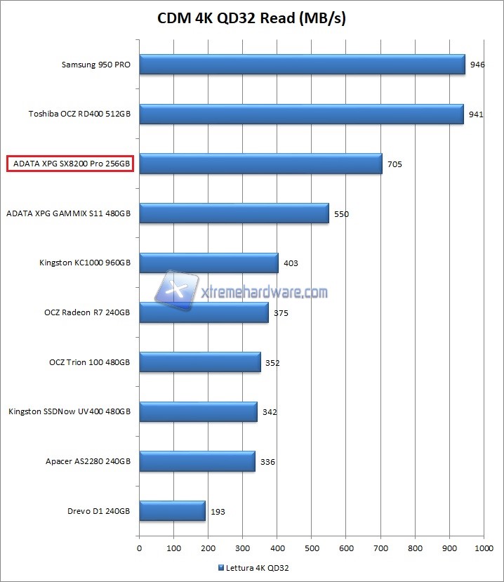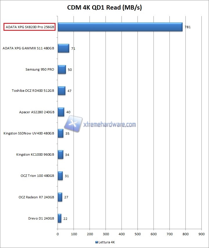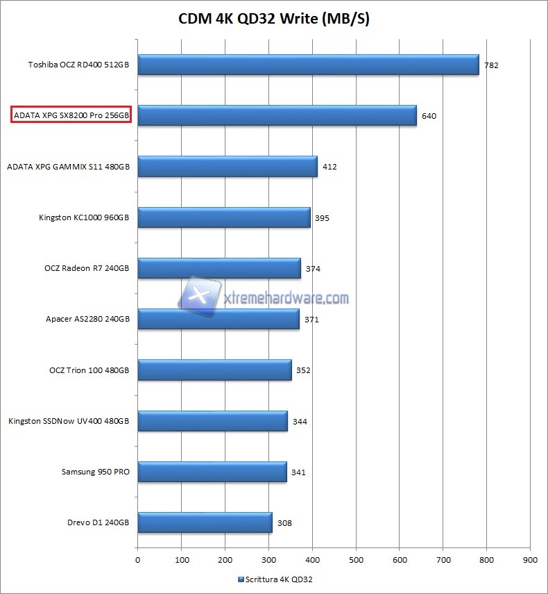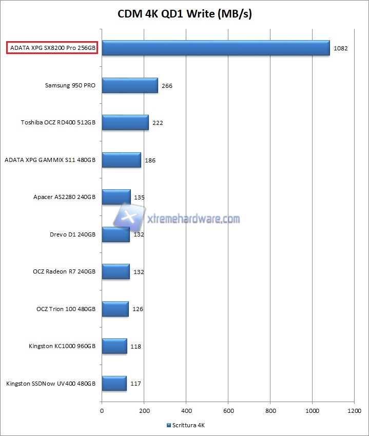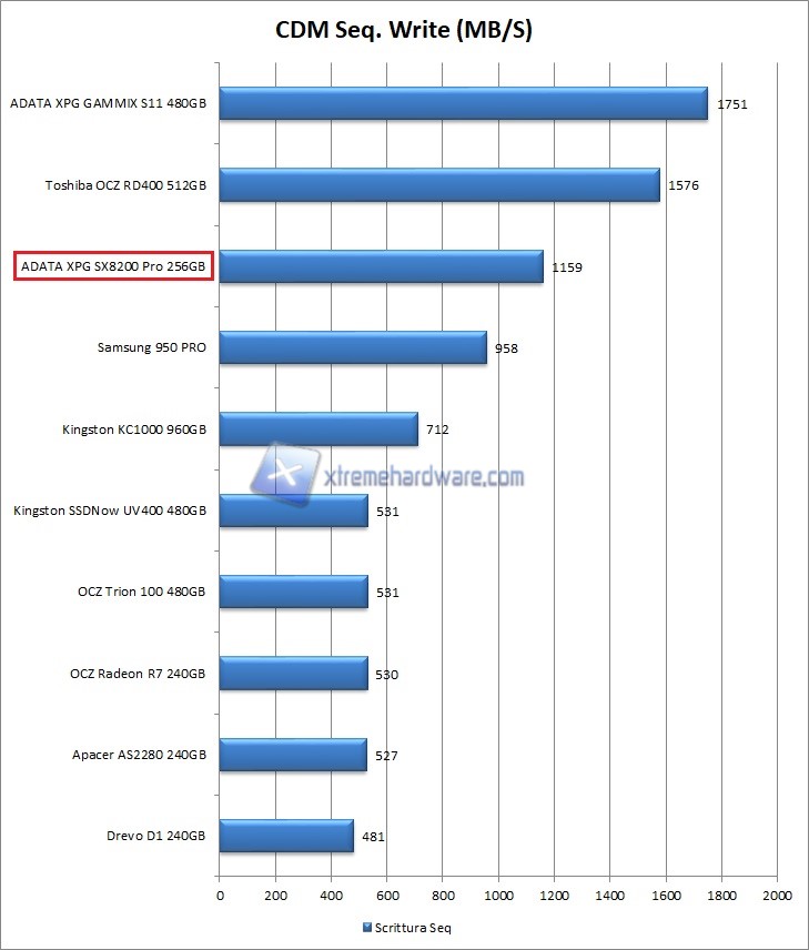 A seguire i grafici con i valori ottenuti dall’ADATA XPG SX8200 Pro da 256GB: