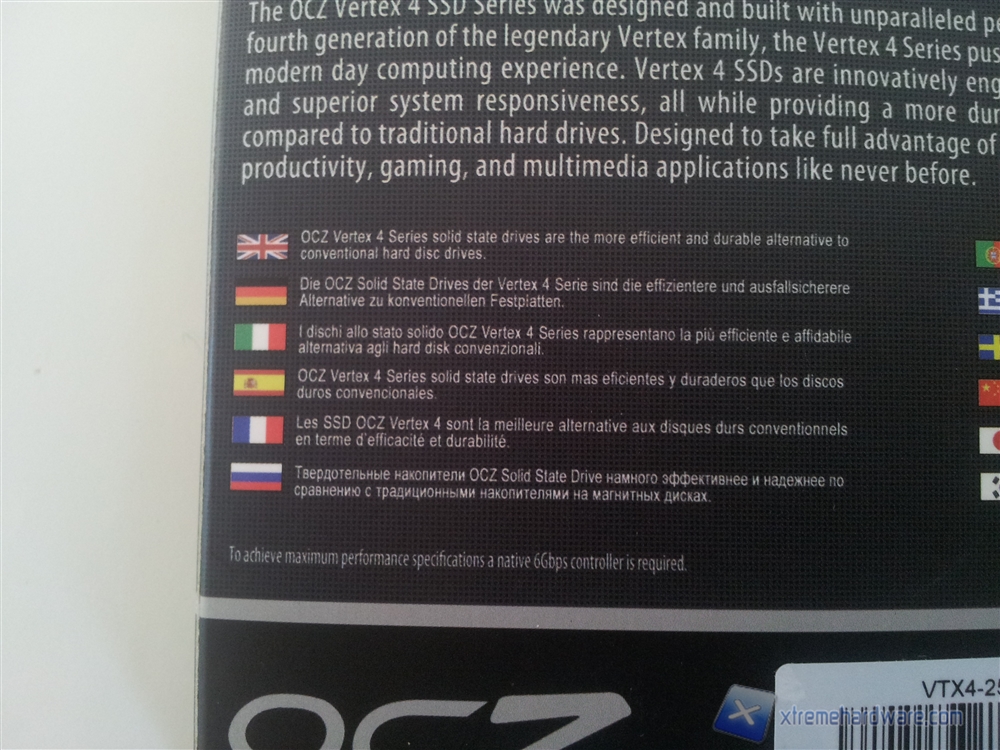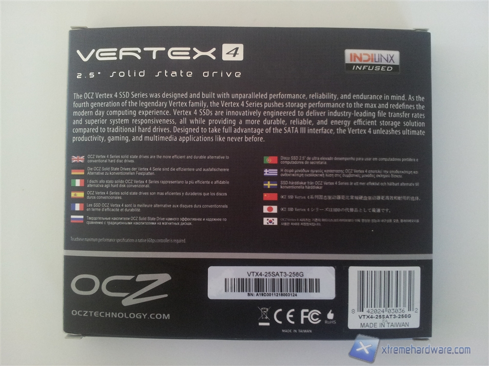 Nella parte posteriore è presente una breve spiegazione della serie Vertex 4, la stessa, in versione ridotta, è tradotta in varie lingue tra cui anche l'italiano. Nella parte bassa troviamo infine il serial number, utile in caso di RMA.