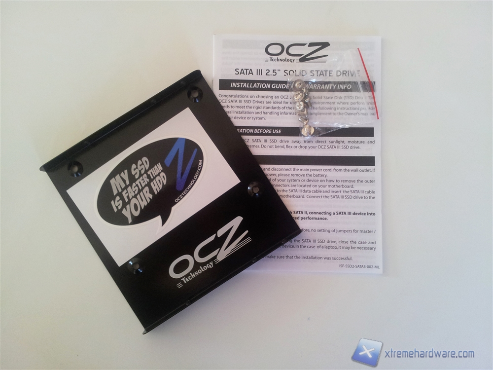 Una volta estratto il contenuto della confezione troveremo l'adattatore da 3,5" to 2,5" avvolto in una busta di plastica ed ancorato in un cofanetto in cartone all'interno del quale troveremo un manuale d'instalalzione del drive, il classico adesivo "my SSD is faster than your HDD" e infine il drive e le viti incastonate all'interno di un frame in poliuretano.