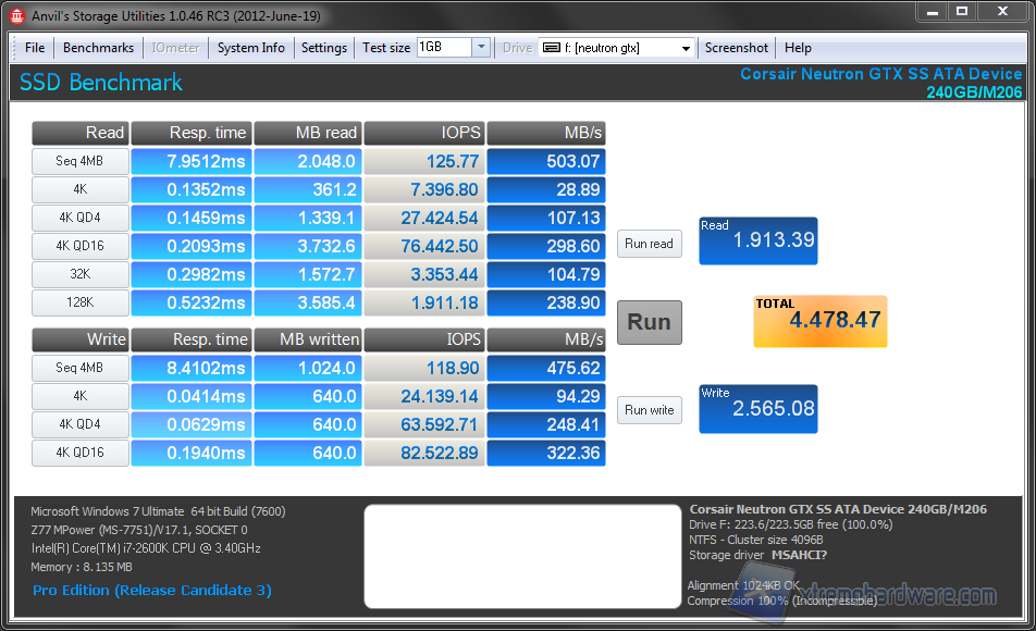 Questo nuovo bench introdotto nella nostra suite di test, chiamato Anvil's Storage Utilities, è pensato appositamente per gli SSD ed è in grado di testare i drive sotto ogni  aspetto. I risultati ottenuti sono sempre molto elevati, per darvi una idea gli abbiamo confrontati con quelli ottenuti utilizzando un Corsair Force GT da 120GB, come si può notare, il risultato finale del nuovo Neutron GTX è più del doppio rispetto a quello ottenuto con un Force GT, c'è però da premettere che il Force GT in questione è un drive vissuto e quasi saturo di dati.