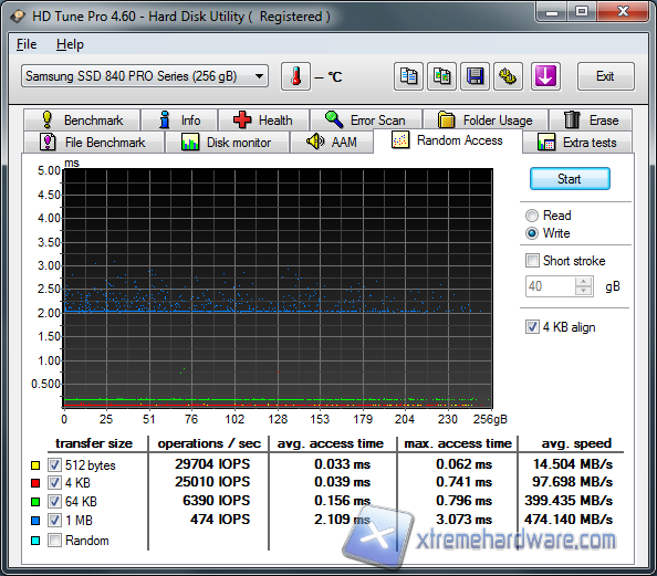 Per la lettura media con HD Tune, è il Samsung 840 a posizionarsi al vertice, ma la versione PRO non è affatto distante. È in scrittura che si viene a creare la maggiore differenza. La versione liscia si colloca appena dietro al precedente 830, ma la versione PRO ottiene il valore assoluto maggiore.