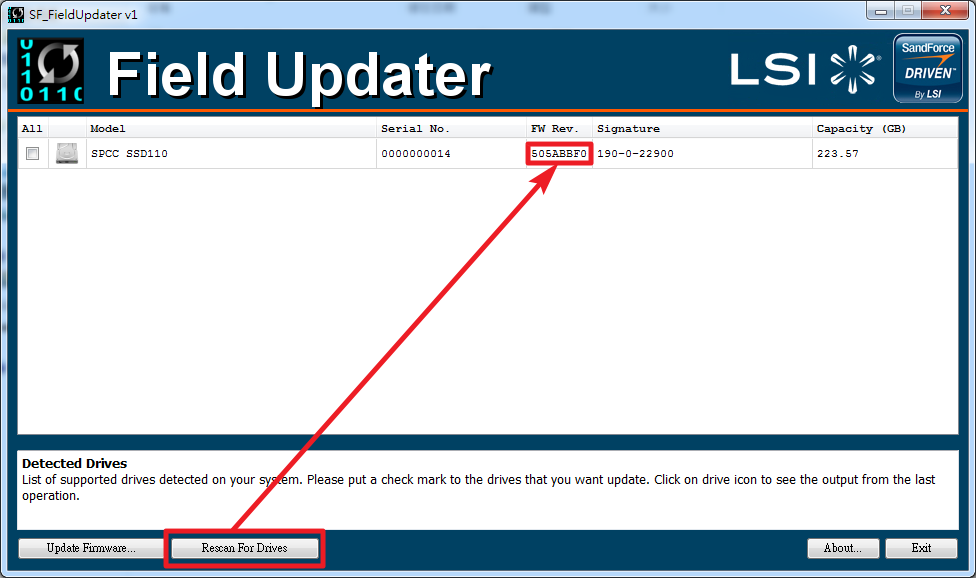 Per prima cosa occorre procedere al lancio del programma con il consueto doppio click sul file SSD FieldUpdater.exe, che appena si avvia procede alla scansione delle unità SSD installate. Si procede alla selezione del drive con il quale si vuole procedere all'upgrade e con il cliccare sul tasto Update Firmware che aprirà un'altra finestra che ci permetterà di selezionare il firmware da installare.